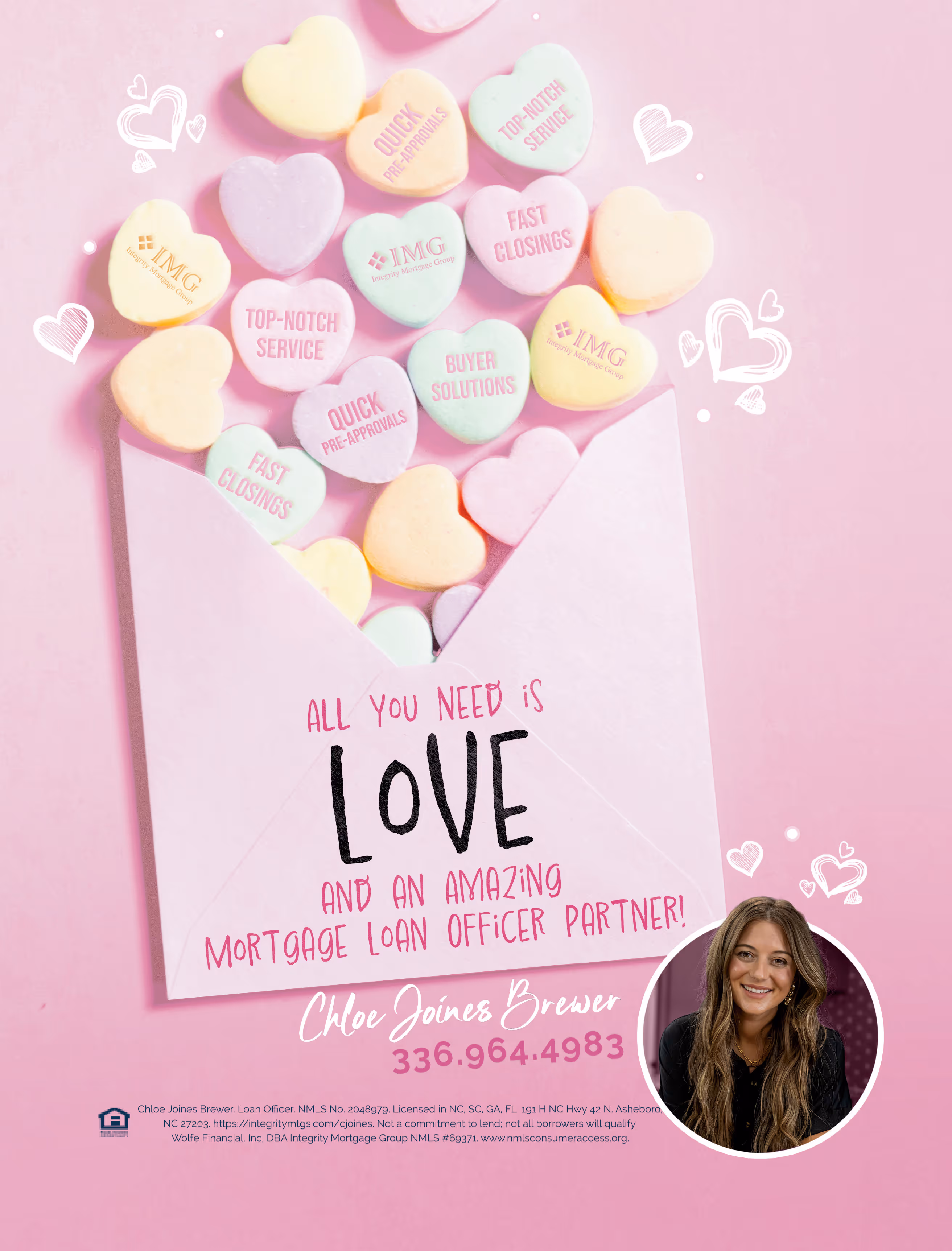 Chloe Joines, mortgage loan officer with Integrity Mortgage Group, is licensed in North Carolina, Georgia, and Florida (NMLS 2048979). She works with homebuyers on a range of financing needs—from first-time purchases to refinances and equity-based strategies—helping clients navigate the mortgage process with confidence, clarity, and personalized guidance.