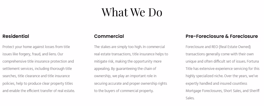 Fortuna Title is your single point of contact for all Title and Closing related services. We’re committed to our clients, moving through every step of the process with detail and efficiency. We deliver timely and accurate real estate information to save you time while giving you the peace of mind you deserve.