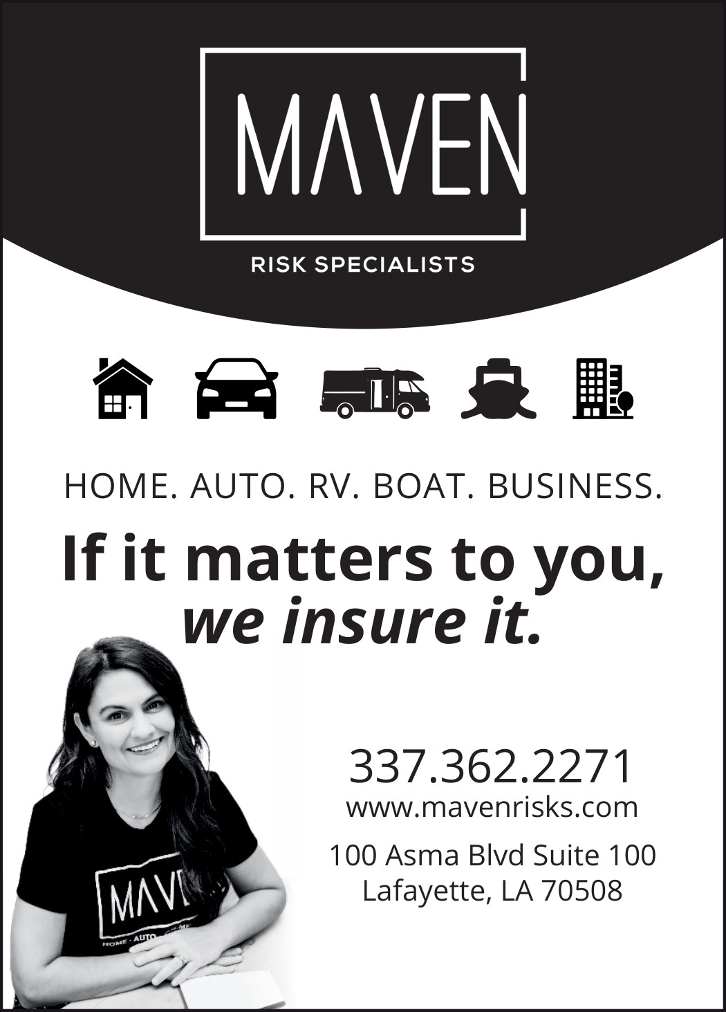 The Maven Risk Specialists team is your local source for risk control services and insurance solutions. We take pride in offering five-star support to all our customers throughout the Lafayette area. Our experienced agents have the expertise to customize policies for your auto, home, and business insurance requirements.