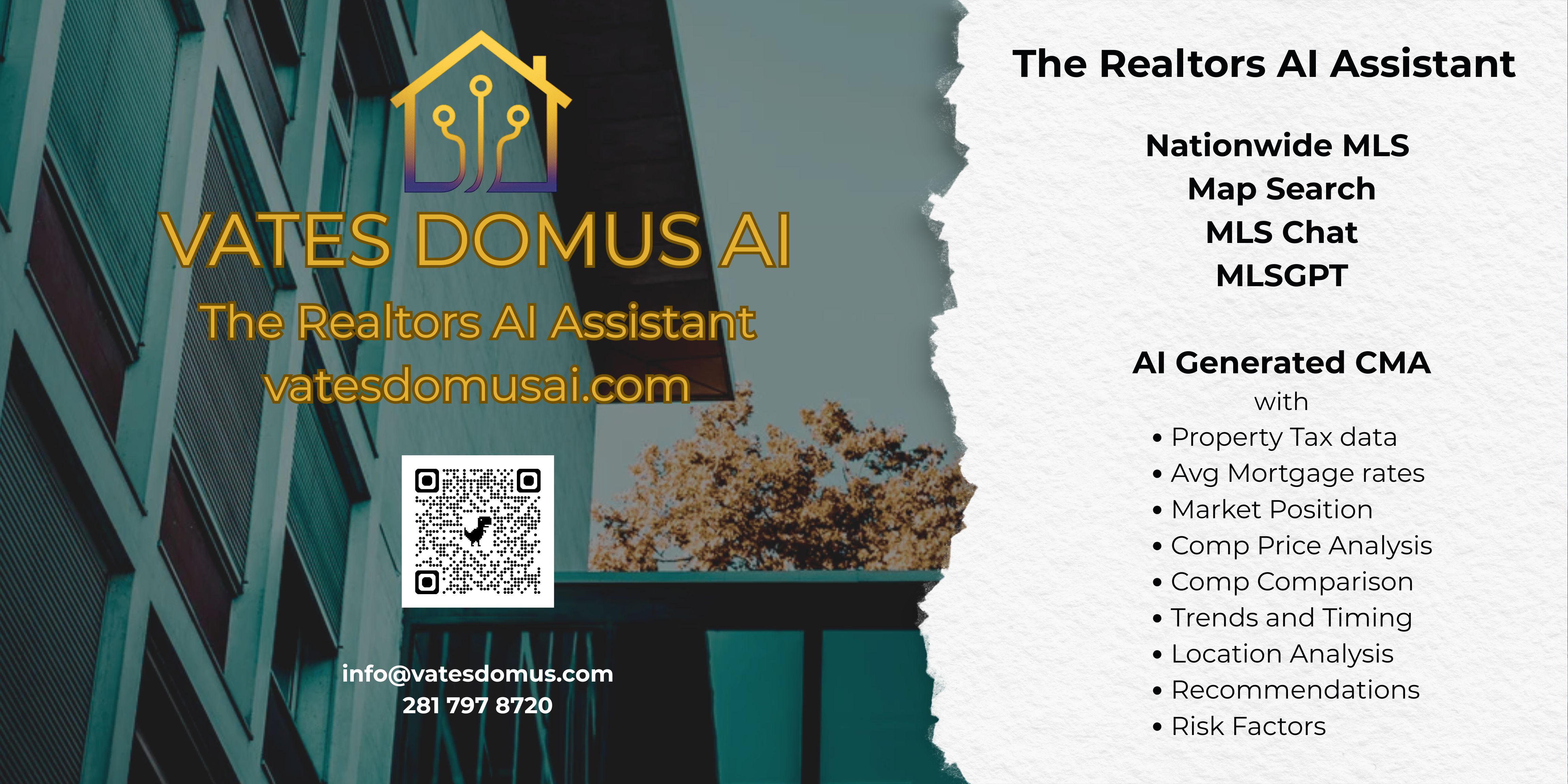 Vates Domus AI is a real estate–focused AI platform built to help agents work smarter, faster, and with more confidence. Our tools transform complex MLS data, and property details into clear insights—powering features like MLS GPT, AI-driven CMAs where you choose the comparables, Tax Record Search and MLS GPT assistance for listing descriptions.